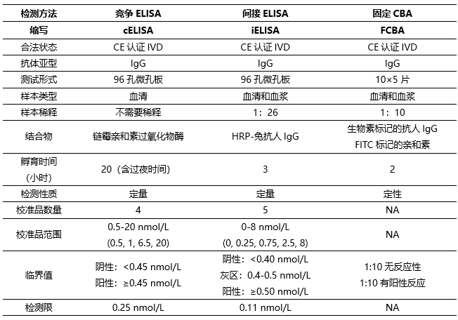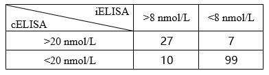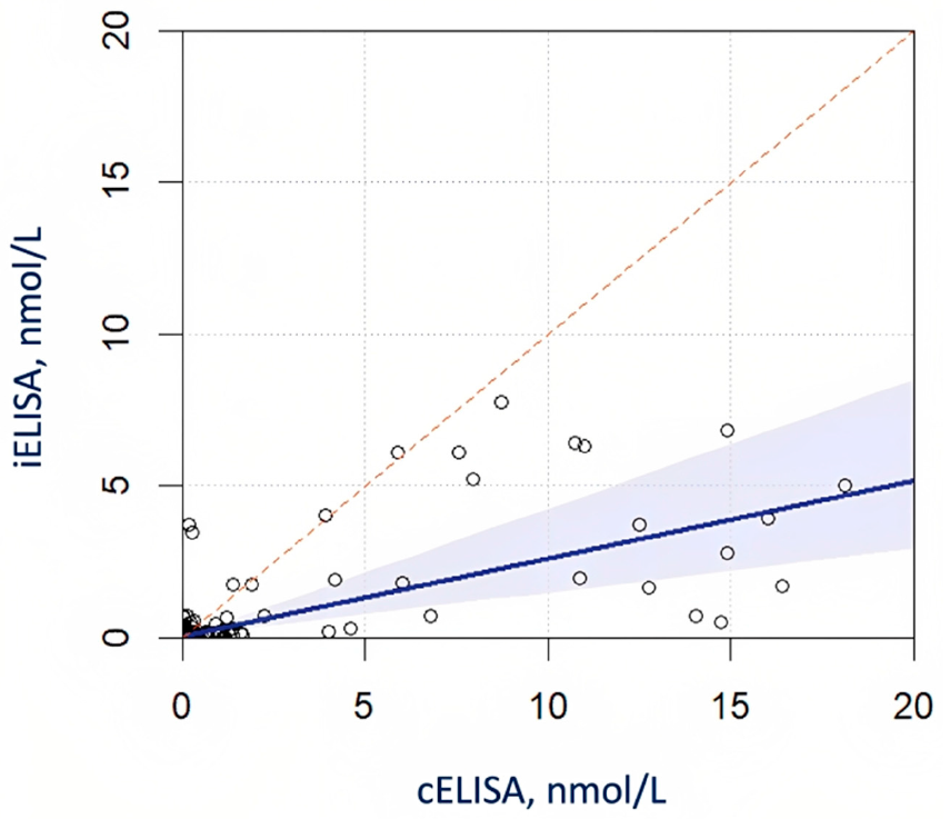 圖2 三種方法檢測結果的結合數(shù)據(jù) 3. 兩種定量ELISA法的相關性分析 進一步比較cELISA法和iELISA法兩種定量方法。為此,排除所有受試者高于檢測范圍的結果(共44例),即cELISA法 >20 nmol/L和/或iELISA法 >8 nmol/L。在排除回歸分析的44例受試者中,27例cELISA > 20 nmol/L,iELISA > 8 nmol/L,7例cELISA > 20 nmol/L,但iELISA < 8 nmol/L,10例cELISA < 20 nmol/L,iELISA > 8 nmol/L。