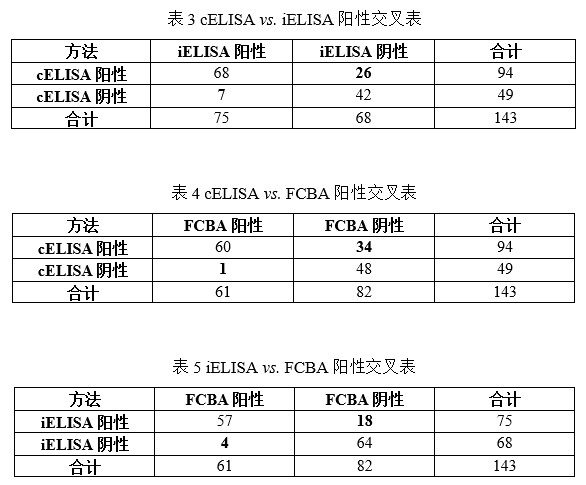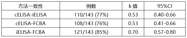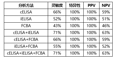 排除44例后,得到99對有效的AChR抗體數(shù)據(jù)。從Passing-Bablok回歸分析中,我們得到斜率和截距分別等于0.26 (95%CI 0.14-0.42)和0.03(-0.02-0.06)(圖3)。 ![]() 圖3 cELISA < 20 mmol/L和iELISA < 8 mmol/L受試者的Passing- Bablok回歸分析。 4. 靈敏度和特異性 70名健康對照者三項AChR抗體檢測結果均為陰性。表6報告了所有AChR抗體試驗的靈敏度(Se)、特異性(Sp)、陽性預測值(PPV)和陰性預測值(NPV)。 表6 三種測試的分析性能評估。 ![]() 在醫(yī)療衛(wèi)生中,陰性預測值指檢驗結果為陰性的受試者中全部真正陰性受試者的比例,可以反映一項診斷技術排除非患者的能力。 討論 AChR抗體檢測是目前診斷MG的重要工具,即使血清AChR抗體水平很低也足以證實臨床懷疑[9]。此外,AChR抗體水平的逐漸升高可在典型MG癥狀出現(xiàn)前2年檢測到[27]。 放射免疫法(RIPAs)具有較高的特異性和靈敏度,分別達到99%和85%,是檢測AChR抗體的金標準[13]。此外,RIPAs也是一種定量方法,抗體水平的定量可能有助于患者的監(jiān)測。然而,RIPAs也有一定的局限性,主要是使用放射性試劑。隨著時間的推移,非放射性替代方法已經開發(fā)出來并實現(xiàn)商業(yè)化。這其中ELISA是使用最多的。在過去的十年中,CBA也被引入到MG的診斷中。CBA是一種基于細胞膜中高水平抗原(即AChR)表達的方法,可以是活細胞的(LCBA)或固定細胞的(FCBA)。LCBA已被證明具有高度特異性和靈敏度[28]。然而,在臨床實踐中使用LCBA受到阻礙,因為它需要較強的專業(yè)知識和細胞培養(yǎng)設施。 在這項研究中,我們比較了FCBA與兩種ELISA法在MG患者群體中的分析性能。本研究的主要發(fā)現(xiàn)如下: (1) 與iELISA和FCBA相比,cELISA的AChR抗體檢出率最高; (2) iELISA與FCBA的一致性最好; (3) 考慮到分析范圍的不同,iELISA和cELISA之間的連續(xù)水平的比較沒有提供額外的信息。事實上,26%的斜率表明iELISA總體上給出的值是cELISA的三分之一; (4) cELISA的分析性能最高。 總體而言,我們的研究結果表明,cELISA比iELISA和FCBA具有更好的分析性能。ELISA比CBA(無論是活細胞還是固定細胞)有一些優(yōu)勢: (1) CBA經歷主觀解讀,這與讀片者的專業(yè)知識有關,可能影響其可重復性。 (2) CBA只能提供定性結果。 (3) cELISA不需要稀釋。 本研究的主要局限是缺乏與RIPAs的比較。需要對更大的隊列進行進一步研究,比較市售AChR抗體檢測方法的診斷性能。 |