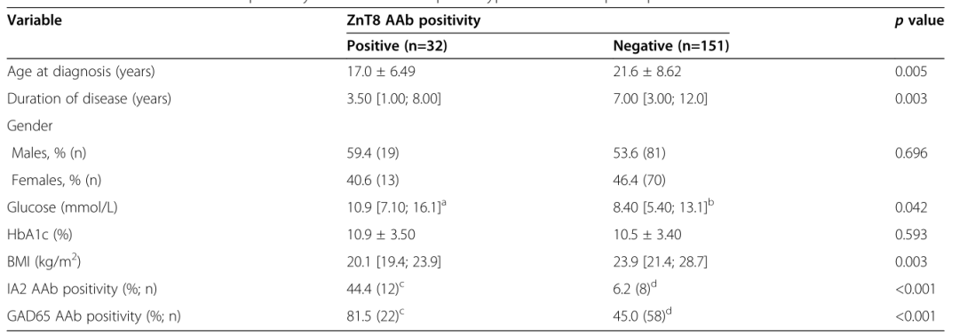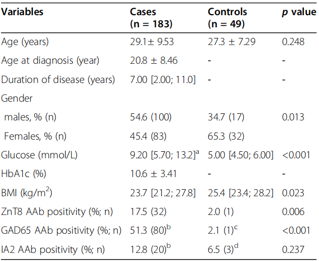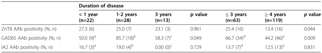 鋅轉(zhuǎn)運(yùn)蛋白8 (ZnT8)自身抗體在南非黑人1型糖尿病患者中的檢出率發(fā)表時間:2023-04-03 10:01作者:RSRTJ 要點 1. 南非黑人1型糖尿病患者(中位病程為7年)中ZnT8抗體的檢出率為17.5%,在新診斷的受試者(病程< 1年)中檢出率為27.3%。 2. ZnT8抗體陽性患者組與陰性患者組相比,診斷時年齡較小,病程較短,血糖較高,BMI較低。 3. 患者自身抗體數(shù)量越多,診斷時年齡越小,病程越短。 1型糖尿病(T1D)是一種慢性自身免疫性疾病,特點是存在靶向胰島β細(xì)胞特異性抗原的自身抗體(AAbs),導(dǎo)致胰島素分泌功能被破壞,抗體可能在T1D臨床診斷前數(shù)年就已出現(xiàn)[2,3]。靶向鋅轉(zhuǎn)運(yùn)蛋白8 (ZnT8)的自身抗體已在T1D[4]中被描述。ZnT8由8q24.11染色體上的SLC308基因編碼,位于胰島β細(xì)胞[5]的胰島素分泌顆粒膜中。ZnT8可介導(dǎo)Zn2 +進(jìn)入分泌顆粒,通過六聚體的形成穩(wěn)定胰島素[6,7]。 多項研究已經(jīng)確定了T1D中ZnT8 AAb陽性的檢出率與種族有關(guān)。在歐洲,新診斷T1D患者中ZnT8 AAb的檢出率在60%至80%之間[4,8 - 11]。中國和日本研究報告的檢出率分別為32.9%(48/146)和36%(40/112)[12,13]。T1D遺傳學(xué)聯(lián)盟發(fā)現(xiàn),在新診斷的非西班牙裔黑人受試者(病程<3年)中,ZnT8 AAb檢出率為57.9% (Wenzlau et al.,2015)。 ZnT8 AAb的檢出率已被證明隨著疾病病程的增長而下降。Howson[14]等在英國T1D患者中進(jìn)行的研究顯示,ZnT8 AAb陽性率在病程≤2年的患者中為58%,而病程≥9年的患者中降至10%。Fabris[10]在意大利的一項T1D研究中發(fā)現(xiàn),在前4年病程中,ZnT8 AAb的檢出率基本保持穩(wěn)定(發(fā)病時為61.1%,1年為56.0%,2-4年為59.3%),然后在≥5年時顯著下降至33.8%。在巴西、日本和非西班牙裔白人人群中進(jìn)行的研究中,隨著疾病病程的延長,ZnT8 AAb檢出率也出現(xiàn)了類似的下降[9,15,16]。 ZnT8 AAb在新診斷的兒童T1D中比成人T1D更普遍。瑞典的一項研究發(fā)現(xiàn),在15 - 34歲發(fā)病的新診斷受試者中,ZnT8 AAb陽性的檢出率為66%(227/343),而在發(fā)病年齡為2-17歲的年輕隊列中,檢出率為80%(200/249)[8]。在波蘭新診斷的T1D患者隊列中,ZnT8 AAb在兒童中檢出率為81.1%(177/218),中位年齡9歲[四分位數(shù)范圍:6-13歲]),而在成人中檢出率為34.8%(52/149),中位年齡34歲[17]。在亞洲人群中也觀察到ZnT8 AAb陽性與診斷年齡較小的相關(guān)性[12,16]。 在85例新診斷的烏干達(dá)T1D患者(< 25歲)的隊列中,ZnT8 AAb陽性的檢出率為17.6%[18]。一項針對新診斷的埃塞俄比亞T1D患者(≤35歲)的研究發(fā)現(xiàn),ZnT8 AAb的總檢出率為10.2%(24/236)。雖然ZnT8 AAb陽性隨著診斷年齡的增加而下降,但年齡組間檢出率差異無統(tǒng)計學(xué)意義(0-15歲:16.7%(6/36)vs. 16-35歲:9.0%(18/200,p =0.161)[19]。一項針對生活在美國的索馬里移民的研究發(fā)現(xiàn),在發(fā)病年齡≤19歲的T1D患者中,ZnT8 AAb檢出率為26%(8/31)[20]。 由于缺乏對撒哈拉以南非洲地區(qū)T1D中ZnT8 AAb的研究,本研究旨在確定南非黑人T1D中ZnT8 AAb的檢出率,并確定ZnT8 AAb陽性是否與診斷年齡和疾病病程相關(guān)。 方法 183例臨床診斷為T1D的南非黑人受試者,于2014年11月至2015年12月期間從Chris Hani Baragwanath學(xué)院醫(yī)院和Charlotte Maxeke約翰內(nèi)斯堡學(xué)院醫(yī)院的糖尿病門診招募。 49例非糖尿病黑人受試者(對照組)是從南非輸血服務(wù)機(jī)構(gòu)的獻(xiàn)血活動以及約翰內(nèi)斯堡威特沃特斯蘭德大學(xué)醫(yī)學(xué)院的學(xué)生和工作人員中招募的。對照組招募標(biāo)準(zhǔn)為:隨機(jī)血漿血糖水平< 11.1mmol/L且未服用任何降糖藥物。從患者檔案中獲取患者糖化血紅蛋白(HbA1c)和葡萄糖水平。有慢性胰腺炎、妊娠期糖尿病或2型糖尿病表現(xiàn)的受試者被排除在研究之外。 ZnT8, GAD65和IA-2抗體使用美國KRONUS的ELISA試劑盒測定。根據(jù)產(chǎn)品說明書,ZnT8和IA-2 AAb濃度≥15 U/ml, GAD65 AAb濃度≥5 IU/ml為陽性。 結(jié)果 1. T1D組和對照組患者的臨床和表型特征 表1總結(jié)了研究受試者的臨床和表型特征。T1D患者與對照組相比,男性更多(54.6% vs 34.7%,P =0.013),血糖水平更高(9.2 vs 5 mmol/L,P <0.001),ZnT8抗體檢出率更高(17.5% vs. 2.0%;P =0.006),GAD65抗體檢出率更高(51.3 vs. 2.1%;P <0.001)。而對照組的BMI明顯高于患者組(25.4 vs 23.7;p = 0.023)。T1D診斷時的平均年齡為20.8±8.46歲,中位病程為7 (2.00;11.0)年。 表1 研究受試者的臨床和表型特征 ![]() 2. 自身抗體陽性,診斷年齡和病程 1)ZnT8 AAb陽性與T1D患者的臨床特征的相關(guān)性 T1D患者的臨床特征與ZnT8 AAb陽性的相關(guān)性見表2。ZnT8 AAb陽性患者組與陰性患者組相比,確診年齡較小,病程較短,血糖較高,BMI較低。此外,ZnT8 AAb陽性患者組中,IA-2抗體和GAD65抗體檢出率也明顯更高。 表2 T1D患者中ZnT8 AAb陽性與臨床和表型變量的關(guān)聯(lián) ![]() 2)病程與抗體檢出率 在病程跨度上,1年內(nèi)、1-2年、3年之間,ZnT8和IA-2 AAb檢出率差異無統(tǒng)計學(xué)意義(p = 0.961, p = 0.729),而GAD65 AAb陽性差異有統(tǒng)計學(xué)意義(p = 0.049)。然而,病程≥4年的受試者與病程≤3年受試者相比,ZnT8和GAD65 AAb檢出率顯著下降(表3)。 表3 根據(jù)病程T1D患者中抗體檢出率 ![]() 3)T1D患者自身抗體數(shù)量與臨床特征的相關(guān)性 結(jié)果表明,患者自身抗體數(shù)量越多,診斷時年齡越小(p = 0.008),病程越短(p = 0.022)(表4)。此外,檢出自身抗體(無論數(shù)量多少)的患者B