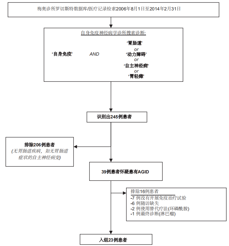 免疫治療作為評估懷疑為自身免疫性胃腸動力障礙患者的診斷試驗發(fā)表時間:2023-08-28 09:09作者:RSRTJ 亮點提取 本研究首次提供了免疫治療可能逆轉(zhuǎn)自身免疫性胃腸動力障礙(AGID)的客觀證據(jù),并闡明了考慮自身免疫在獲得性特發(fā)性胃腸動力障礙中的實際重要性。 本研究的目的是評價免疫治療用于診斷和治療AGID的輔助作用。 本研究是一項回顧性病例系列研究,納入了梅奧診所診治的23例懷疑AGID患者,并對這些患者進行了免疫治療試驗(靜脈注射免疫球蛋白或甲潑尼龍)。17例患者經(jīng)免疫治療后病情好轉(zhuǎn)。 前言 自身免疫性胃腸動力障礙(AGID)是一種新近認識的臨床疾病,是自身免疫性自主神經(jīng)功能障礙的局限性表現(xiàn),可作為特發(fā)性或副腫瘤性現(xiàn)象發(fā)生。AGID的臨床表現(xiàn)有胃輕癱、結(jié)腸無力或假性腸梗阻;少數(shù)病例表現(xiàn)為幽門梗阻或肛門痙攣。癥狀包括早飽、惡心、嘔吐、腹脹、腹瀉、便秘和非自主的體重減輕。亞急性或隱匿起病,可伴有輕微或明顯的神經(jīng)系統(tǒng)表現(xiàn)。 在AGID中,第一種被識別的免疫球蛋白G (IgG)生物標志物是1型抗神經(jīng)元核自身抗體(ANNA-1,也被稱為抗Hu抗體)。ANNA-1血清陽性預(yù)測潛在的小細胞癌(少數(shù)是胸腺瘤)或兒童神經(jīng)母細胞瘤;與ANNA-1相關(guān)的AGID通常對治療反應(yīng)不佳。另一種伴有靶向包含α3亞基的神經(jīng)節(jié)煙堿型乙酰膽堿受體(gAChR)自身抗體的AGID,通常對抗體耗竭療法有良好響應(yīng)。在主動和被動免疫動物模型中,gAChR抗體均被證實可引起AGID。其他有助于AGID的診斷的幾種特異性神經(jīng)自身抗體包括:電壓門控鉀離子通道復(fù)合物抗體(VGKC Ab)、電壓門控鈣離子通道抗體(N-VGCC Ab和P/Q-VGCC Ab)、肌肉型乙酰膽堿受體抗體(AChR Ab)、橫紋肌抗體、谷氨酸脫羧酶65抗體(GAD65 Ab)和外周蛋白抗體。在31%的外周蛋白IgG血清陽性患者中,胃腸動力障礙是一個突出的癥狀。 用于AGID管理的對癥治療包括止吐藥、促動力藥(如紅霉素)和膽堿酯酶抑制劑。目前有發(fā)現(xiàn)患者在免疫治療后癥狀出現(xiàn)改善,但迄今尚未發(fā)現(xiàn)客觀證據(jù)可證明免疫治療使病情緩解。有研究者建議將免疫治療試驗作為懷疑患自身免疫性神經(jīng)系統(tǒng)疾病患者的診斷工具,靜脈注射甲潑尼龍(IVMP)和大劑量免疫球蛋白(IVIg)被認為是安全且合適的治療。目前僅在兩種免疫介導(dǎo)的神經(jīng)系統(tǒng)疾病(慢性炎性脫髓鞘性多發(fā)性神經(jīng)病和重癥肌無力)中進行過隨機對照試驗。本研究評估了免疫治療在懷疑AGID患者中的診斷性試驗的效用。在免疫治療試驗前后進行的核素胃腸傳輸研究和測壓提供了療效的客觀證據(jù)。 材料與方法 一、方法 1. 研究對象:由梅奧診所AGID研究小組成員進行該研究,連續(xù)評估23例懷疑患有AGID的患者,納入標準見圖1。 ![]() 圖1:入組患者的確認流程圖 23例患者均伴有胃腸動力障礙的顯著癥狀,19例伴有胃腸動力低下的確證性基線核素成像證據(jù)(即胃排空緩慢,小腸或大腸傳輸延遲),3例測壓結(jié)果異常(胃十二指腸或結(jié)腸;符合神經(jīng)病變)或重度胃腸動力障礙癥狀,1例有全自主神經(jīng)功能障礙(自主神經(jīng)系統(tǒng)的所有部分均受影響)證據(jù)。這些患者均懷疑自身免疫性病因,在試驗基礎(chǔ)上接受免疫治療(不改變其他藥物)4-12周(靜脈注射大劑量免疫球蛋白或甲潑尼龍)。 懷疑自身免疫性病因包括:根據(jù)臨床懷疑(亞急性起病)、神經(jīng)自身抗體血清陽性(71%)或自身免疫性疾病(如甲狀腺炎、系統(tǒng)性狼瘡)的個人/家族史(表1)。 表1 懷疑AGID的臨床特征 ![]() 2. 試驗包括:胃腸傳輸試驗、胃十二指腸測壓、結(jié)腸測壓、自主神經(jīng)功能試驗 3. 神經(jīng)自身抗體檢測 所有患者均接受了全面的神經(jīng)自身抗體評估,包括:神經(jīng)元核抗原(ANNA-1[抗Hu]、[抗Ri])和神經(jīng)元細胞質(zhì)抗原(amphiphysin、浦肯野細胞抗體1型[抗Yo]、和Tr、塌陷反應(yīng)調(diào)節(jié)蛋白5 [CRMP-5]和外周蛋白)特異性IgG。還分析了P/Q-VGCC抗體、N-VGCC抗體、VGKC抗體、gAChR抗體、肌肉AChR抗體、橫紋肌抗體、GAD65抗體。 4.免疫治療應(yīng)用 23例患者均完成了6-12周的治療試驗。15例接受靜脈注射免疫球蛋白(IVIg;0.4 g/kg),5例接受靜脈注射甲潑尼龍(IVMP)治療(每日1,000 mg,連續(xù)3天,之后每周1次)。2例患者接受IVMP治療5天,隨后進行IVIg。1例患者在接受IVIg治療3天后出現(xiàn)無菌性腦膜炎,隨后口服潑尼松(60 mg/d),再后口服麥考酚酯12周。 結(jié)果 討論 自身免疫作為胃腸動力障礙基礎(chǔ)的文獻記載是近年來才出現(xiàn)的。本研究描述的17例響應(yīng)者提示,免疫治療可能逆轉(zhuǎn)AGID,說明了在獲得性特發(fā)性胃腸動力障礙中考慮自身免疫基礎(chǔ)的現(xiàn)實意義。癥狀改善通常伴有胃腸動力和自主神經(jīng)功能改善的客觀證據(jù),這些證據(jù)來自反復(fù)的核素成像、測壓和自主神經(jīng)功能測試。這些支持性測試為未來的隨機對照臨床試驗提供了有效的改善替代標志物。 在免疫治療前進行胃腸道傳輸試驗和/或測壓的客觀檢查對于確認存在胃腸動力障礙和作為判斷治療反應(yīng)的指標都很重要。本研究提供的AGID的診斷線索包括:在71%的響應(yīng)者中檢測到一種或多種特異性神經(jīn